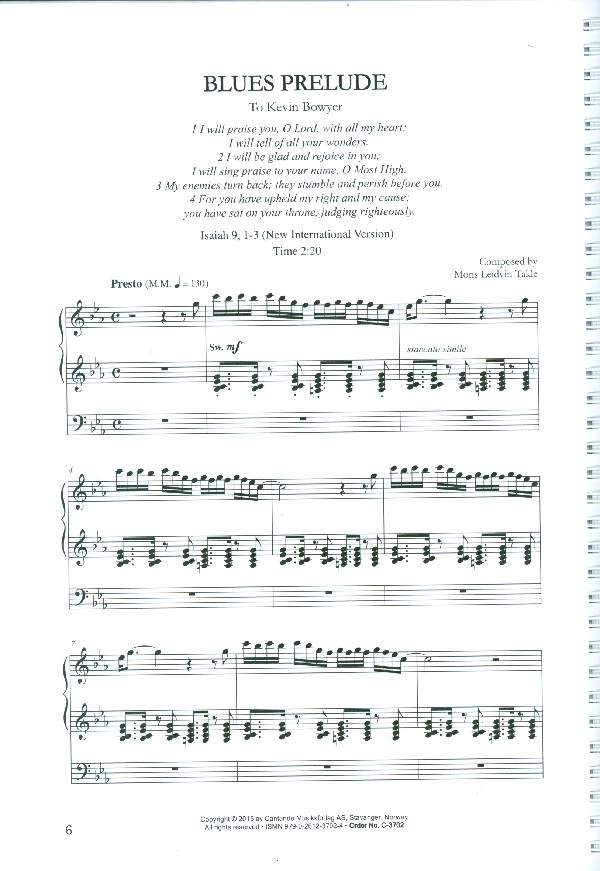Blues Prelude (new) Principal Blues Take Five Blues Amazing Grace Hymn to Freedom Dreams of Today Our Heaven Two Part Blues f major (new) Two Part Blues a minor (new) Swing Love (new) Pedal Blues (new) The Place of my Childhood (new) Calling for You (new) Kven kan seia ut Lo in the Wilderness Sarajevo Meditation Blues Toccata
