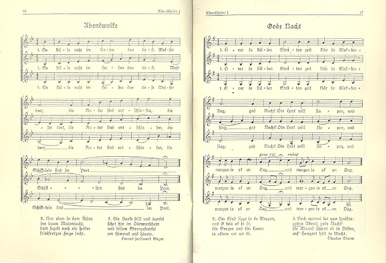DAS TAGEWERK IST ABGETAN DER ABEND SINKT DIE SONNE SINKT VON HINNEN DIES IST EIN HERBERGSZIMMER EH ICH MICH NIEDERLEGE FRIEDLICH BEKAEMPFEN NACHT SICH UND TAG KOMM FUERCHTE DICH NICHT NOCH HINTER BERGES RANDE NUN HAUCHT MIT KAELTERN WINDEN OVER DE STILLEN STRATEN SO STILLE RUHT IM HAFEN ABENDLIEDER