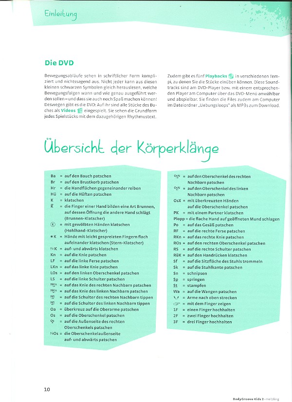 Bodypercussion für Kinder und Jugendliche von 9-13 Jahren BodyGroove ist das mitreißende und systematisch Lern- und Spielkonzept für Körperpercussion. Die dreibändige Reihe ist für den Gruppenunterricht mit 6-18-Jährigen konzipiert. Sie wendet sich an Leiter von Kinder- und Jugendgruppen in Schule und Musikschule, in freien Trommelgruppen, Chören und Orchestern.- Bodypercussion in der Gruppe ist pures Bewegungs- und Rhythmusvergnügen. Durch das abwechslungsreiche, bunte Übungssystem kann Rhythmus in vielen Facetten gelehrt und 'begriffen' werden. Die Kinder und Jugendlichen erwerben auf vielfältige Weise zunehmend komplexere rhythmische Fähigkeiten.- Bodypercussion in der Gruppe ist pures Bewegungs- und Rhythmusvergnügen. Nebenbei erwerben die Schülerinnen und Schüler auf vielfältige Weise elementare rhythmische Fähigkeiten.- Bodypercussion ist ein abwechslungsreiches, buntes Übungssystem, mit dem Rhythmus in vielen Facetten gelehrt und 'begriffen' werden kann.- Bodypercussion ist fast überall einsetzbar und fasziniert mit variablen Sounds und raffinierten Bewegungsfolgen.- Bodypercussion ist eine Einladung zur schöpferischen Arbeit mit Rhythmus und Musik, sie fördert Geschicklichkeit, Mut und Spontanität, schult Aufmerksamkeit und Gedächtnis und stärkt Selbstbewusstsein, Kommunikationsfähigkeit und Fantasie.Die Rhythmusstücke von BodyGroove Kids 2 für den Unterricht im mittleren Altersbereich von ca. 9 bis 13 Jahren sind voller Sprach- und Bewegungswitz, herausfordernd und anregend. Mit einstimmigen Warmups, Übungen und Spielstücken wird das rhythmische 'Handwerkszeug' systematisch aufgebaut und nach und nach erweitert. Über Bewegungskanons und Rhythmicals erfolgt der Einstieg in die Mehrstimmigkeit. Effektvolle Performance-Stücke mit raffinierten Bewegungsfolgen und variablen Sounds bieten Material und Anregungen für bühnenwirksame Aufführungen.Bei allen Stücken helfen Sprechtexte, die Rhythmen zu erfassen und im Gedächtnis zu behalten. Methodische Anregungen zum Erlernen der Stimmen, zum Aufbau der Mehrstimmigkeit, zum Einsatz improvisatorischer Elemente u.v.m. helfen bei der Planung und Gestaltung des Unterrichts. Eine Vielzahl von Spielvarianten erleichtert den passgenauen Einsatz in Ihrer Gruppe - sei es in der Schule oder Musikschule, im Chor oder in der Trommelgruppe.Über die HELBLING Media App sind alle Stücke als Videos in lebendigen Aufnahmen voll mitreißender Spielfreude zu sehen und mit den jeweiligen Texten zu hören, um einen optischen und akustischen Eindruck des Zusammenspiels zu vermitteln. Das gemeinsame Anschauen motiviert die Schüler und hilft ihnen, die Bewegungsabläufe schneller zu erfassen. Zudem gibt es Audios mit Übungsloops in verschiedenen Tempi, die als Soundtracks die Einübungsphase der Stücke unterstützen.