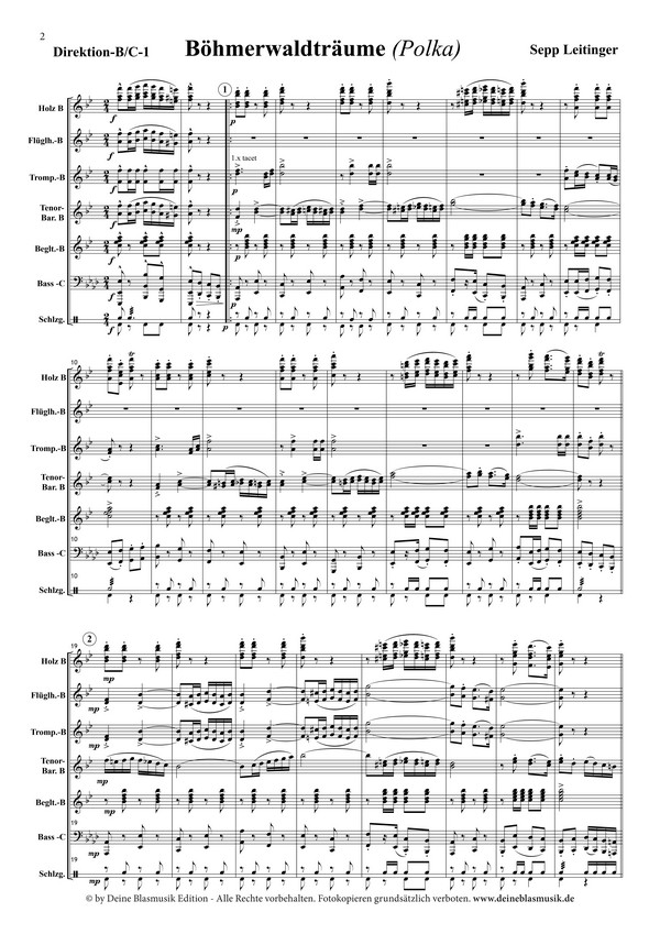Polka Sepp Leitingers Polka bietet alles, was Publikum und Musikanten gleichermaßen vom Böhmerwald träumen lässt: lyrische Melodienbögen, die von den Hörner im tiefen und hohen Blech getragen werden, perlende, perkussive Einwürfe der Holzbläser, die auch mal die Melodie übernehmen, eine gefühlvolle, aber trotzdem druckvolle Begleitung der Tuben und Posaunen sowie strahlende Trompeten-Signale und Melodielinien. Mit 'Böhmerwaldträume' kommen die Freunde böhmischer Blasmusik voll auf ihre Kosten.