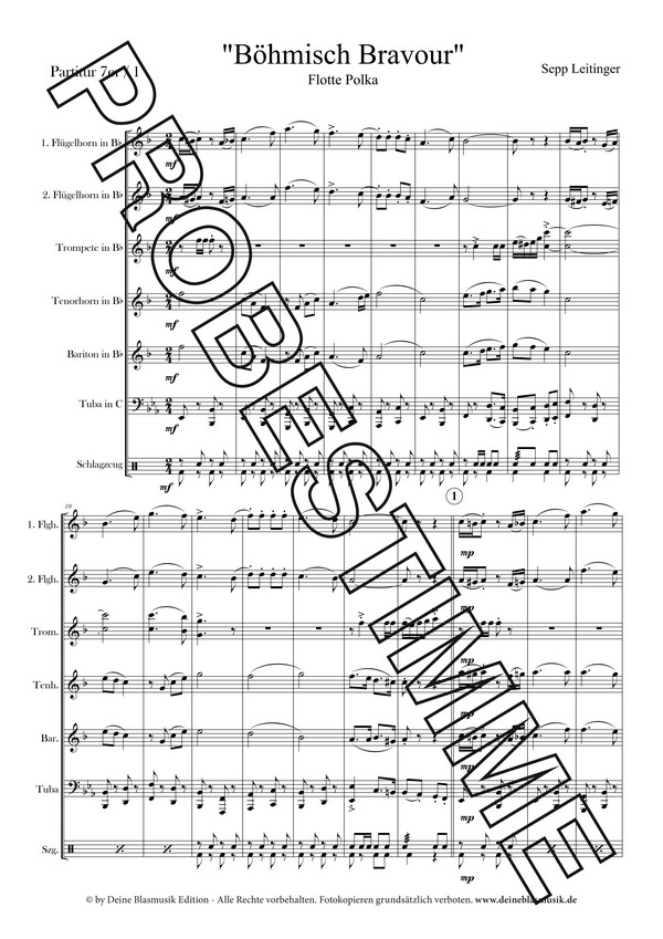 Mit 'Böhmisch Bravour' hat der Salzburger Komponist Sepp Leitinger eine Polka geschaffen, die ganz im Zeichen der böhmischen Tradition steht. Diese schwungvolle Komposition zieht alle Register der Polkamusik und verzaubert die Zuhörer vom ersten Takt an - ein perfektes Mittel, um die Sorgen des Alltags hinter sich zu lassen. Leichte, einprägsame Melodien wandern durch die verschiedenen Orchesterregister und entfalten einen bunten musikalischen Reigen. Ein verspieltes Holzregister, dynamische Bässe und ein treibender Rhythmus sorgen für Abwechslung und Temperament. 'Böhmisch Bravour' - eine Polka voller Lebensfreude und Schwung, die jeden Blasmusikfreund begeistern wird!