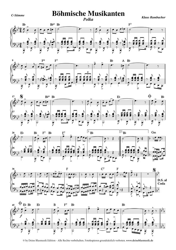 Polka Wenn 'Böhmische Musikanten' aufspielen, dann erwartet man eine Polka, die der Region gerecht wird. Eine flotte Einleitung, synkopische Melodieführungen, ein anspruchsvolles und fetziges Basssolo sowie lyrische Passagen im Trio. All das bietet Klaus Rambacher mit seiner neuen Polka, die garantiert auch Ihr Publikum mitwippen und im Trio von den Bänken reißen lässt.