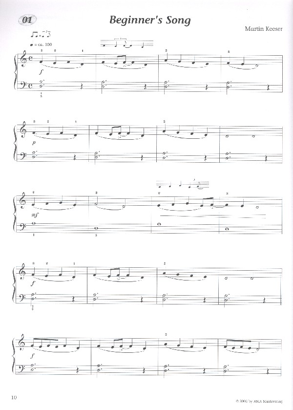 Fun school 33 leichte Stücke In instruktiver, behutsam fortschreitender Weise wird in diesem Heft versucht, den angehenden Klavierspieler an die rhythmischen und technischen Besonderheiten der swingenden Spielweise heranzuführen. Dabei gestalten sich die Grenzen zwischen Boogie, Blues und Swing fließend, ohne strenge Abgrenzung. Die gängigen Begleitungen der linken Hand werden gezielt und in progressiver Schwierigkeit geschult. Erste kleine Variationen und Andeutungen des Solo-Spiels sollen dem Lernenden einen Vorgeschmack auf das so weite Gebiet der Improvisation und vielleicht auch ein paar Anregungen für eigene Versuche geben. In diesem Sinne versteht sich dieses Heft vor allem als Bereicherung der ersten Jahre des Klavierunterrichts, als Ergänzung klassischer Unterrichtslektüre um spieltechnische und klangliche Aspekte, die den Spaß am Musizieren ebenso fördern wie die handwerklichen Fähigkeiten dafür. In seinem zweiten Buch Boogie, Blues, Swing versammelt Martin Keeser 33 Kompositionen, die den klassischen Klavierunterricht der ersten Jahre begleiten sollen. Bei der Auswahl der Stücke waren Keesers Schüler mitbeteiligt: so flossen ihre Kritik, Verbesserungsvorschläge und vor allem der Spaß am Spiel mit ein. So spiegelt das Stück Traffic das hektische Verkehrstreiben einer Großstadt wieder und der gemächlich wippende Schaukelstuhl in Rockin Chair lädt zum Ausruhen ein. Mit den Stücken möchte der Autor die Pianisten an die rhythmischen und technischen Besonderheiten der swingenden Spielweise heranführen: er spannt den Bogen von ganz einfachen Blues-Stücken bis hin zu technisch anspruchsvollen Boogie-Nummern, die Grenzen zwischen den im Titel genannten Musikrichtungen bleiben dabei fließend. Die linke Hand wird mit gängigen Begleitpattern gezielt und in ansteigendem Schwierigkeitsgrad geschult. Die handwerklichen Fähigkeiten, die ein Pianist für den Swing, Boogie und Blues benötigt, werden eingeübt. In einer Einleitung gibt der Autor zu jedem Stück wichtige Anmerkungen, z. B. wie ein Stück interpretiert werden kann oder wofür eine Titelbezeichnung steht. Um den Schülern auch Lust auf mehr zu machen, gibt er in einzelnen Kompositionen auch einen Vorgeschmack auf das weite Feld der Improvisation mit kleinen Variationen und Andeutungen von Solo-Spiel. Die Kompositionen wurden für die CD vom Autor selbst eingespielt und sollen das Kennenlernen der Stücke, in einer für die jungen Schüler eher ungewohnten Musikrichtung, erleichtern. In einem zweiten Schritt dienen die Aufnahmen dann als Vergleichsmöglichkeit zu dem Erlernten. Dem Komponisten ist ein Heft gelungen, dessen Stücke gut klingen, leicht umsetzbar sind und dennoch keine anspruchslose Klaviermusik sind und damit auch ins Konzertrepertoire einfließen können. 1. Beginner's Song 2. Divisions On A Ground 3. Wild Horses 4. Fingersnap 5. Boogie Two 6. Sorrow 7. Easy Goin' 8. Boogie 9. Steady 10. Blues It 11. Take A Walk 12. Voicings Left 13. Traffic 14. Light As A Breeze 15. First Loss 16. Stomp 17. First Change 18. Blue 19. Lamento In Swing 20. Bells 21. Walk Alone 22. Superfast Eddie 23. Terzenblues 24. Walk The Bass 25. Strollin' 26. Cleveland 27. Sextenboogie 28. Wake Up Call 29. You Gotta Groove 30. Boogie-Rondo 31. Blues in D 32. Rockin' Chair 33. Final Groove