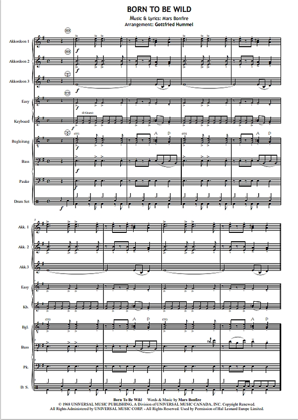 Hummel, Gottfried, arr. Es gibt Lieder, die sind Kult, da sie nicht nur für eine ganze Ära, sondern auch für ein pures Lebensgefühl stehen. Eines dieser Lieder ist nun im topmodernen Arrangement für Akkordeonorchester, natürlich u.a. mit Easy Stimmen für die kleinen ''Easy Rider'', rockigem Keyboard flexibler Begleitstimme mit Chords für z.B. Gitarre, erschienen. Spätestens seit dem Film ''Easy Rider'' sind Biker- Filmszenen ohne den Soundtrack von ''Born to be wild'' nicht mehr vorstellbar. Vermitteln sie auch in ihrem Konzert das Gefühl von Freiheit On the Road