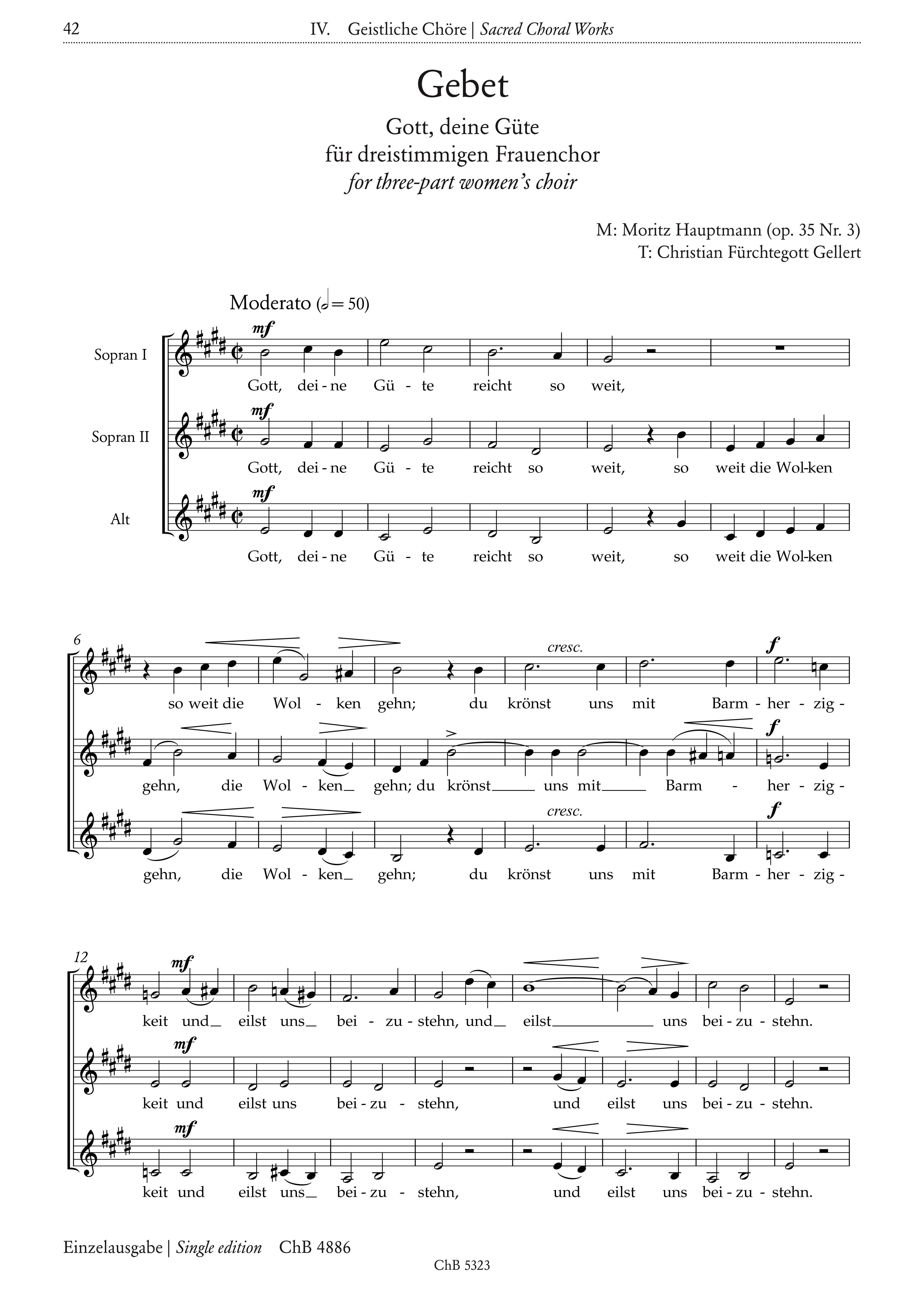Chorbibliothek Band 1 Die Reihe Breitkopf & Härtel Chorbibliothek fasst zum ersten Mal nahezu alle lieferbaren Einzelausgaben für Chor aus 300 Jahren Verlagsgeschichte zusammen. Posse, Sebastian, ed Chorbuch GEISTLICHE MUSIK I. Weihnachtslieder und -motetten II. Lobgesänge III. Psalmvertonungen IV. Geistliche Chöre V. Messen, Messsätze und Hymnen WELTLICHE MUSIK I. Liebeslieder und Balladen II. Natur- und Abendlieder III. Kinderlieder IV. Abschiedslieder und ernste Stücke V. Tanz- und Volkslieder Veni creator spiritus (Berlioz) Ave Maria op.12 (Brahms) Herr wie lange op.27 (Psalm 13) (Brahms) 3 geistliche Chöre op.37 (Brahms) 4 Gesänge op.17 (Brahms) 12 Lieder und Romanzen op.44 (Brahms) Die Ziege hat Zahnweh (Bresgen) Kyrie (David) Messe op.67 (David) Woodburry-Liederbüchlin (Eisler) Gebet Gott deine Güte (Hauptmann) 2 kleine Weihnachtsmotetten (A. Mendelssohn) 12 altdeutsche Weihnachtslieder (A. Mendelsohn) Komm Heiliger erfülle die Herzen (Raphael) Coronach D836 op.52,4 (Schubert) Gott ist mein Hirt D706 op,posth.132 (Psalm 23 (Schubert) Gott in der natur D757 op.posth.133 Ständchen D921 (2. Fassung) (Schubert) 3 Lieder op.114 (Schumann) Zigeunerleben op.29,3 (Schumann) Be still my Soul (aus Finlandia op.26) (Sibelius) Missa beatae Virginis (Strohbach) Tanz rüber tanz nüber