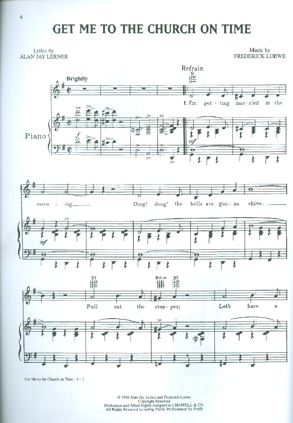 Lerner and Loewe My Fair Lady : Get me to the Church on Time On the Street where you live With a little Bit of Luck Show me I could have danced all Night Wouldn't it be loverly I've grown accustomed to her Face Camelot : Camelot How to handle a Woman The simply Joys of Maidenhood Loved you once in Silence The lusty Month of May Follow me If ever I would leave you Brigadoon : Down on MacConnchy Square Almost like being in Love Brigadoon Come to me bend to me From this Day on The Heather on the Hill I'll go home with Bonnie Jean Jeannie's packin' up The Love of my Life There but for you go I Waitin' for my Dearie Paint your Wagon : I'm on my Way Best Things The first Thing you know Gold Fever The Gospel of no Name City I talk to the Trees I still sea Elisa A Million Miles behind the Door They call the Wind Aria Wand'rin Star