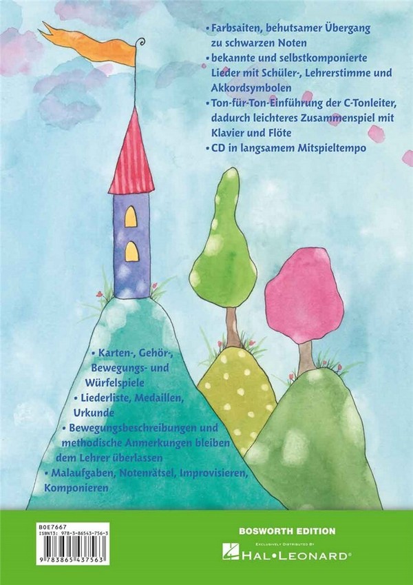 Geigenschule für Kinder von 5-9 Jahren mit Liedern, Spielen und Rätseln Sadr, Soheyla, Illustrationen Eine sehr liebevoll gestaltete, bunte Schule mit vielen lustigen Illustrationen für die kleinen Geigenschüler. Sie kann als eigenständiges Lehrwerk verwendet werden, eignet sich aber ebenso als Ergänzungsliteratur zu anderen Instrumentalschulen. Die Spiralbindung erleichtert das Aufschlagen. Zunächst wird mit farbig gestalteten Noten begonnen, später wird behutsam zu schwarzen Noten übergegangen. Gespielt werden bekannte Lieder und Eigenkompositionen mit Schüler- und Lehrerstimmen (mit Akkordsymbolen zur Begleitung). Die C-Tonleiter wird Ton-für-Ton eingeführt und erleichtert so das Zusammenspiel mit Klavier und Flöte. Ergänzend gibt es Malaufgaben und Rätsel zum Notenlernen, Improvisieren, Komponieren nach vielen Lektionen außerdem ein Karten-, Gehör-, Bewegungs- oder Würfelspiel zum spielerischen Erlernen des vorangegangenen musiktheoretischen Hintergrundes. Eine Liederliste zum Abhaken, Medaillen und die begehrte Urkunde zum Sichtbarmachen und Belohnen der Lernfortschritte komplettieren die Schule. Im 1. Band wird das Spiel auf leeren Saiten eingeführt sowie elementare Bogeneinteilungen mit Vierteln, Halben Noten und Viertelpause, forte und piano bis zum Beginn des Greifens über alle Saiten mit Fingerzahlen und der Einführung in die Notenlehre.