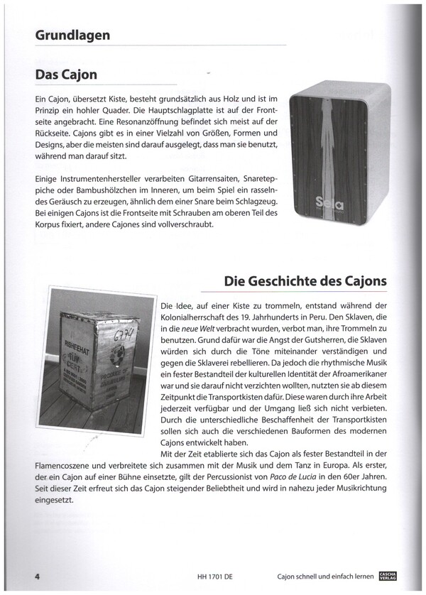 Ideal für Anfänger Grundlagen Spieltechniken Mit dieser Schule kannst du bereits nach kurzer Zeit die ersten Grooves auf deinem Cajon spielen. Die Kombination von Lehrbuch und Lernvideos bietet dir den idealen Einstieg. Alle Videos und Playbacks kannst du per QR-Code über dein Handy oder Tablet abspielen. Die wichtigsten Grundlagen werden kurz und einfach erklärt. Danach geht es gleich los mit dem Spielen. Alle Rhythmen und Grooves werden in verschiedenen Schwierigkeitsstufen vermittelt. Die Lernvideos bieten den idealen Anschauungs-Unterricht, denn der komplette Inhalt des Lehrbuchs wird darin visuell wiedergegeben. Zu jeder Musikstilrichtung gibt es ein Playback zum selber Mitspielen. So macht Cajon spielen Spaß!