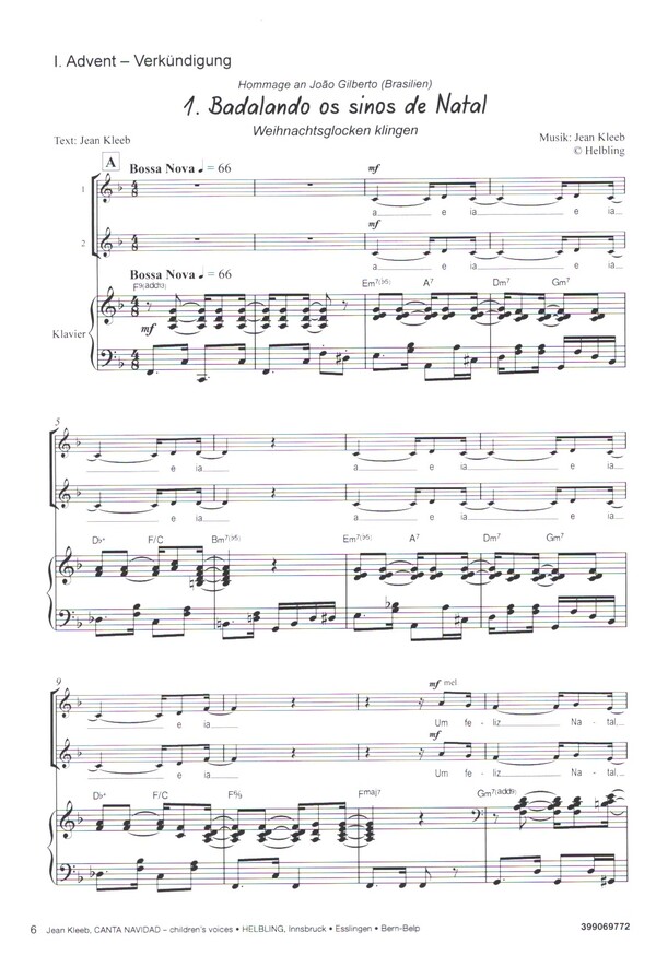 Kleeb, Jean, arr. Die Musikwelt Lateinamerikas ist bekanntlich schwungvoll und vielfältig, wobei die weihnachtliche Musik oft europäisch geprägt ist. Canta Navidad vereint 14 Lieder, die weltlich, traditionell und folkloristisch sind und einen wunderbaren Eindruck der weihnachtlichen Musikkultur in Lateinamerika vermitteln. Die Chorkantate erzählt die Weihnachtsgeschichte anhand verschiedener lateinamerikanischer Musikstile von Argentinien bis Mexiko in vier Teilen: Advent und Verkündigung Die Hirten Geburt Jesu Nach der Geburt und Dreikönigsfest Alle Lieder der Sammlung bieten neben dem originalen Text auf Portugiesisch, Spanisch oder Quechua eine singbare deutsche und englische Übersetzung. Die Chorsätze für gemischten Chor SATB oder SAB sind meistens einfach gehalten manche Arrangements sind nahe am Original, andere etwas ausgefeilter. Dabei steht die Beschäftigung mit den typischen Stilen und Rhythmen aus Lateinamerika stets im Vordergrund. Die Gesamtpartitur enthält die Klavierstimme in gut spielbarer Größe sowie die Percussion-Stimmen (hinten in der Ausgabe als Kopiervorlage) und Kopierblätter für die Kinder. Sollte der gemischte Chor die Weihnachtskantate mit Kinderchor aufführen (die Kinder singen dann meist die Melodiestimme mit), bietet die Gesamtpartitur dazu die Kopiervorlagen für die Kinder. Inhalt: Badalando os sinos de Natal (Weihnachtsglocken klingen / The Bells Chime) Velo que bonito (Schau, wie schön / See How Beautiful) Corre Caballito (Lauf, Pferdchen / Little Horse, Run) Estrela de Natal (Weihnachtsstern /Shining Star) Entrai, entrai Pastorinhas (Kommt rein, ihr Hirtinnen / Come in, All Shepherds) Calix Bento (Heil'ger Gral / Holy Grail) - Huachi torito (Der kleine Stier / The Little Bull) Navidadau (Huahanacá) A la Media Noche (Um Mitternacht / At the Hour of Midnight) No la debemos dormir Noche Santa - El Rorro (Das Kindlein / The Babe) Niño Manuelito (Der kleine Manuelito / The Little Manuelito) Los peces en el río (Die Fische im Fluss / The Fishes at the River) Folia de Reis (Dreikönigsfest / Three Kings' Day)
