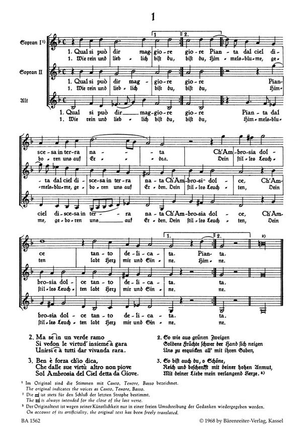Trede, Hilmar, ed Qual si puo dir maggiore Wie rein und lieblich Canzonette d'amore Kleine Lieder der Liebe La fiera vista Grimme Gestalt Raggi dov'e'l mio benne Strahlen leuchtet mir freundlich Il mio martir ten go Verborgenes Leid trag ich Son questi i crespi crinie Macht es dein lockig Haar Su su su che'l giorno e fore Auf auf auf der Tag will kommen Quando sperai Auf deine Huld Tu ridi sempre mai Dein Lachen holde Schöne Chi vuol veder d'inverne Wer will zur Winterszeit
