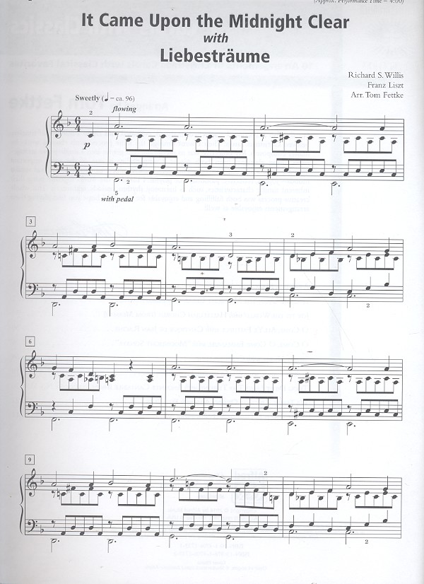 Sacred Performer Series Fettke, Tom, arr. 10 Arrangements of Christmas Carols with classical Favorites Away in a Manger with Lullaby (Brahms) It came upon the Midnight clear with Liebestraum (Liszt) Joy to the World with Hallelujah Chorus (Händel) O come all Ye Faithful with Cantique de Jean Racine (Fauré) O come o come Emmanuel with Moonlight Sonata (Beethoven) Silent Night with Clair de lune (Debussy) Sussex Carol with Waltz of the Flowers (Tschaikowsky) Thou didst leave thy Throne with Andante cantabile (Tschaikowsky) We three Kings of Orient are with Für Elise (Beethoven) What Child is this with Gymnopédie (Satie)