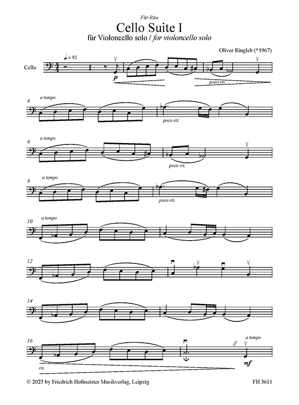 Titel Information: Die Liebe zum Cello begann für Oliver Ringleb im Alter von 17 Jahren, als er als junger Musikstudent mit seiner Band Supersonic in Konstantin Weckers damals legendärem Kaffee Giesing regelmäßig auftrat. Neben Auftritten der Cellistin Anja Lechner beim sonn-täglichen Klassikfrühstück, gastierte dort regelmäßig das Modern String Quartett aus München, dessen damaliger Cellist Jost Hecker ihn mit seinem ausdrucksstarken Cello-Spiel ebenfalls sehr begeisterte. Oliver Ringleb verliebte sich in den warmen, tiefen Klang dieses Instrumentes, komponierte 2014 die erste Solo-Suite für Cello und ließ diese im selben Jahr uraufführen. Gewidmet ist sie seiner Mutter Rita gewidmet. 2015 folgte die Cello-Suite II, in der er den Tod seines Vaters emotional verarbeitet hat. Beide Cello Suiten sind im mittelschweren Schwierigkeitsgrad.