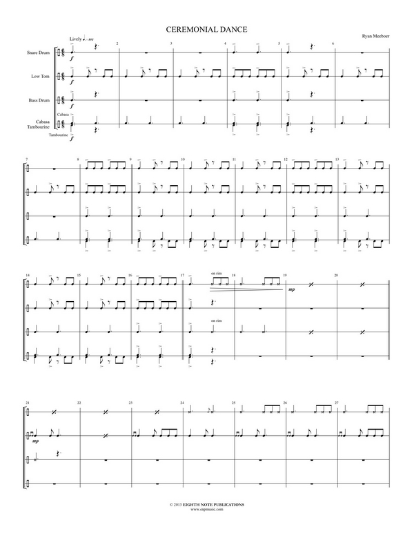 This percussion ensemble (requiring 5 players) is an upbeat piece with the feeling reflecting a dance groove from medieval music,  ,Although written in 6/8 time, parts of the composition use a polyrhythmic feel, crossing 6/8 with 3/4,