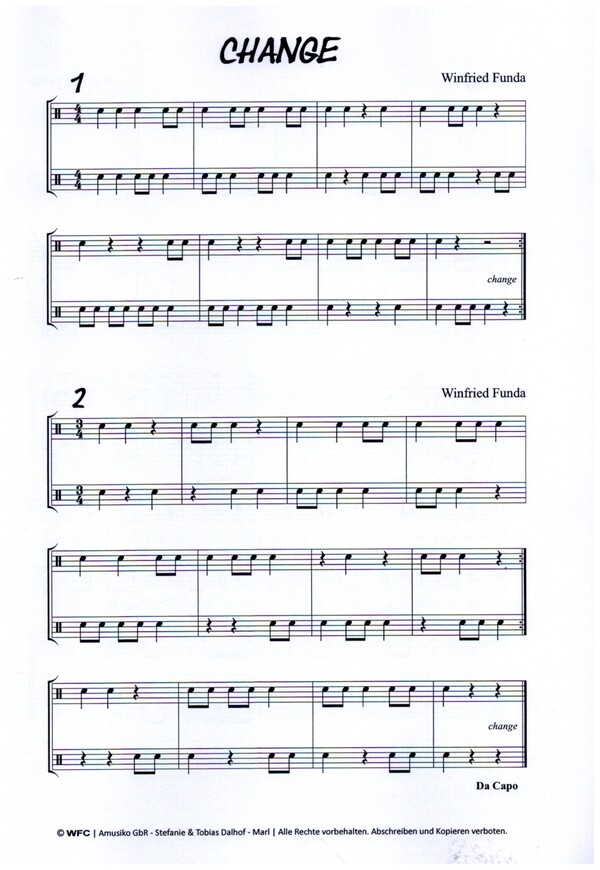 Winfried Funda Conceptions Zehn wechselhafte Duette in variabler Besetzung. Der Titel Change (Wechsel) deutet schon an, was allen Stücken gemeinsam ist: Nach dem 1. Durchgang tauschen die beiden Spieler die Stimmen und wechseln für den 2. Durchgang in die Notenzeile des Spielpartners.