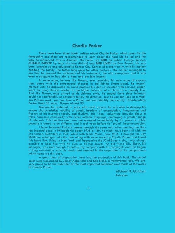 Ah-Leu-Cha Another Hairdo Anthropology Au Privave Au Privave (No. 2) Back Home Blues Ballade Barbados Billie's Bounce (Bill's Bounce) The Bird Bird Gets The Worm Bloomdido Blue Bird Blues (Fast) Blues For Alice Buzzy Card Board Celerity Chasing The Bird Cheryl Chi Chi Confirmation Constellation Cosmic Rays Dewey Square Diverse Donna Lee K.C. Blues Kim Kim (No. 2) Klaunstance Ko Ko Laird Baird Leap Frog Marmaduke Merry Go Round Mohawk Mohawk (No. 2) Moose The Mooche My Little Suede Shoes Now's The Time Now's The Time (No. 2) Ornithology An Oscar For Treadwell Parker's Mood Passport Perhaps Red Cross Relaxin' With Lee Scrapple From The Apple Segment Shawnuff She Rote She Rote (No. 2) Si Si Steeplechase Thriving From A Riff Visa Warming Up A Riff Yardbird Suite