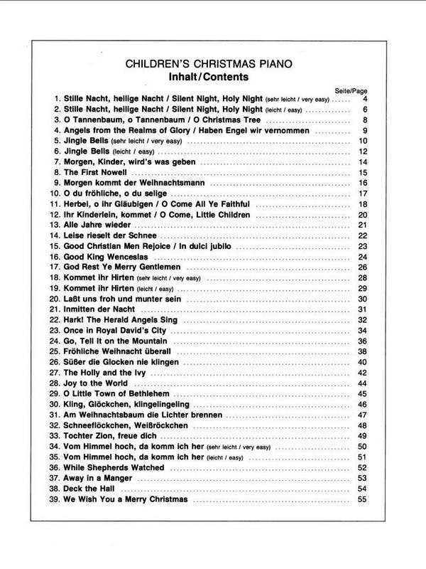 Das Kinder-Weihnachtsalbum mit den bekanntesten und beliebtesten Weihnachtsliedern, die zum Teil auch aus dem englischen Sprachraum übernommen wurden, hier in leichter bis sehr leichter Fassung für Klavier und Keyboard. Viele Stücke mit deutschem und englischem Text, einige davon gibt es in leichter und sehr leichter Version für Klavier. Mit den Akkordsymbolen für Gitarre über dem Notensystem und vielen Zeichnungen. Angels from the realms of glory Jingle bells (sehr leicht) The first nowell Good christian men rejoice Good king Wenceslas God rest ye merry gentlemen Hark! The herald angels sing Once in royal David's city Go, tell it on the mountain The holly and the ivy Joy to the world O little town of Bethlehem While shepherds watched Sway in a manger Feck the hall We wish you a merry christmas