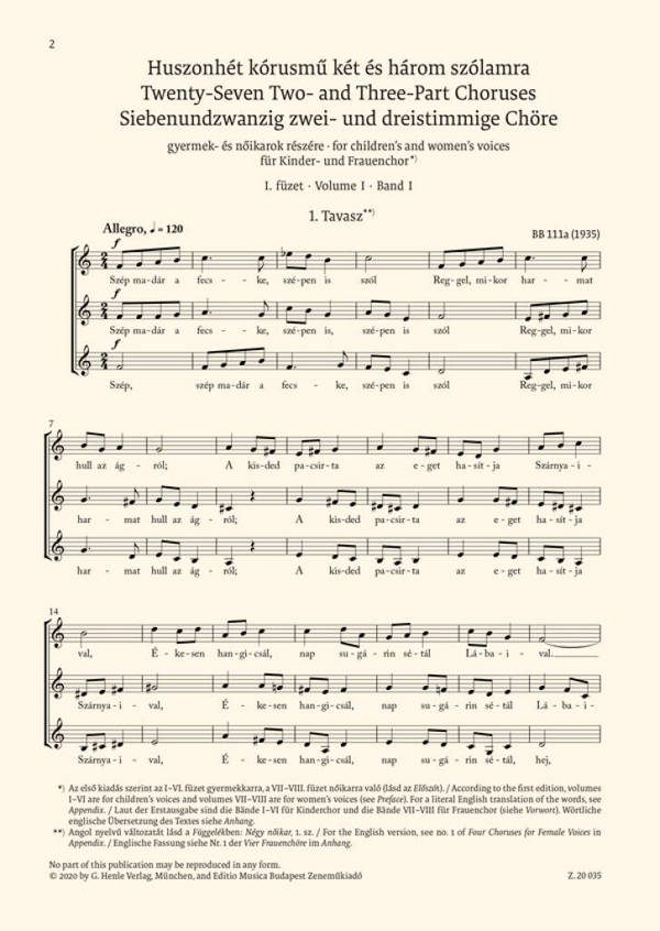 Miklos, Szabó, ed Béla Bartók Complete Critical Edition (Z. 15009), this volume includes Bartók's complete works for children's and female voices. The lyrics in this Urtext edition are in the original languages, but literal English translations are provided in the appendix, which also includes English versions of those of the 27 Two- and Three-Part Choruses that were authorized by the composer.The edition is complete with an informative preface (in Hungarian, English, and German) and detailed Editorial Comments (in Hungarian and English). The Comments give an overview of the textual, folk-music, and compositional sources, and provide detailed information on the performance practice of Bartók's choral works. The edition has been printed on high-quality and environmentally-friendly paper.This volume is also available cloth-bound, along with the volumes for male voices and for mixed voices, in slipcase (Z. 20076). Separate editions of each work included in this volume are also available. 1. Volume I 1. Tavasz 2. Volume I 2. Ne hagyj itt! 3. Volume I 3. Jószág-igézö 4. Volume II 1. Levél az otthoniakhoz 5. Volume II 2. Játék 6. Volume II 3. Leánynézö 7. Volume II 4. Héjja, héjja, karahéjja! 8. Volume III 1. Ne menj el! 9. Volume III 2. Van egy gyürüm, karika 10. Volume III 3. Senkim a világon 11. Volume III 4. Cipósütés 12. Volume IV 1. Huszárnóta 13. Volume IV 2. Resteknek nótája 14. Volume IV 3. Bolyongás 15. Volume IV 4. Lánycsúfoló 16. Volume V 1. Legénycsúfoló 17. Volume V 2. Mihálynapi köszöntö 18. Volume V 3. Leánykérö 19. Volume VI 1. Keserves 20. Volume VI 2. Madárdal 21. Volume VI 3. Csujogató 22. Volume VII 1. Bánat 23. Volume VII 2. Ne láttalak volna! 24. Volume VII 3. Elment a madárka 25. Volume VIII 1. Párnás táncdal 26. Volume VIII 2. Kánon 27. Volume VIII 3. Isten veled! 28. Appendix - Two Romanian Folk Songs (BB 57, 1909?) 29. Appendix - Four Choruses for Female Voices (from Twenty-Seven Two- and Three-Part Choruses with English words) 30. Appendix - Seven Choruses (from Twenty-Seven Two- and Three-Part Choruses with English words)