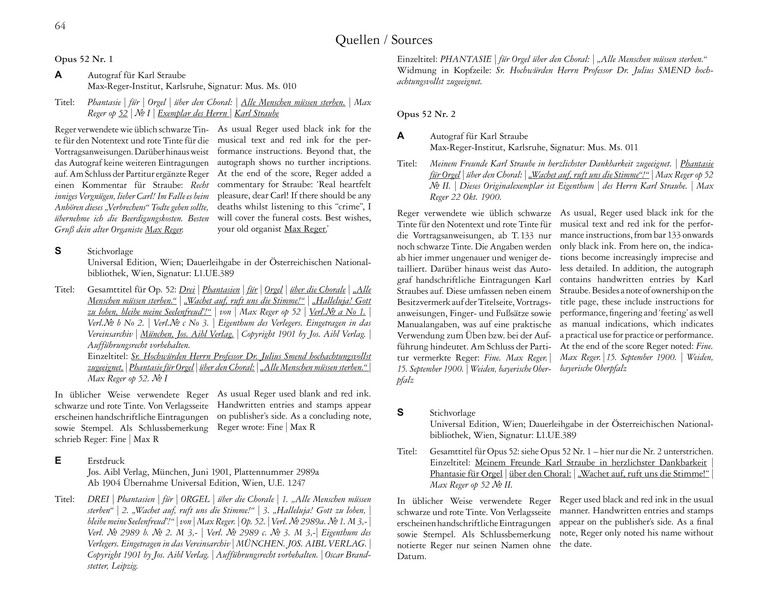 Die sieben Choralfantasien von Max Reger zählen zu den bedeutendsten Orgelwerken überhaupt. Im Spannungsverhältnis von Choralbearbeitung, Programmmusik und symphonischer Dichtung ragen sie aus der Orgelliteratur um 1900 durch die für Reger typische Verbindung von etablierter Form und genialer kombinatorischer Fantasie heraus. Pünktlich zum 150. Geburtstag des Komponisten legt Edition Peters eine neue, grundlegend überarbeitete Urtext-Ausgabe dieses bedeutenden Orgelrepertoires in zwei Bänden vor, herausgegeben von dem international renommierten Organisten und Leipziger Professor für Orgel Martin Schmeding. Als einer der einflussreichsten Reger-Interpreten berücksichtigt Schmeding nicht nur den aktuellen Stand der Forschung, sondern auch die Bedürfnisse an eine zeitgemäße Interpretation der Choralfantasien auf heute verfügbaren Instrumenten. Während in der früheren Peters-Ausgabe von 1977 die aufführungspraktischen Angaben an die Klangästhetik und die technischen Beschränkungen der in den 1970er Jahren verfügbaren Instrumente angepasst worden waren, stellt die vorliegende Urtext-Ausgabe die von Reger intendierte Lesart wieder her. Enthalten sind sämtliche originalen dynamischen und agogischen Angaben (einschließlich der Fortführungsstriche, die in vielen modernen Ausgaben fehlen) sowie alle originalen Registrierungs- und Manualangaben. Frühere editorische Änderungen wurden zurückgenommen. Damit stellt Martin Schmedings Neuausgabe erstmals einen originalen Notentext bereit, der die Anforderungen an eine moderne Urtextausgabe mit dem aktuellen Stand der Orgelinterpretation und den Anforderungen an eine praktische Ausgabe vereint. Grundlegend überarbeitete Urtext-Ausgabe dieses bedeutenden Orgelrepertoires in zwei Bänden Herausgegeben von dem international renommierten Organisten und Professor für Orgel Martin Schmeding Bereinigter Notentext einschließlich originaler Registrierungs- und Manualangaben Mit ausführlichen Werkbeschreibungen sowie Kritischem Bericht @editionpetersgroup /editionpetersgroup /editionpetersgroup Inhalt Fantasie über den Choral Alle Menschen müssen sterben op. 52/1 Fantasie über den Choral Wachet auf! ruft uns die Stimme op. 52/2 Fantasie über den Choral Halleluja! Gott zu loben, bleibe meine Seelenfreud! op. 52/3