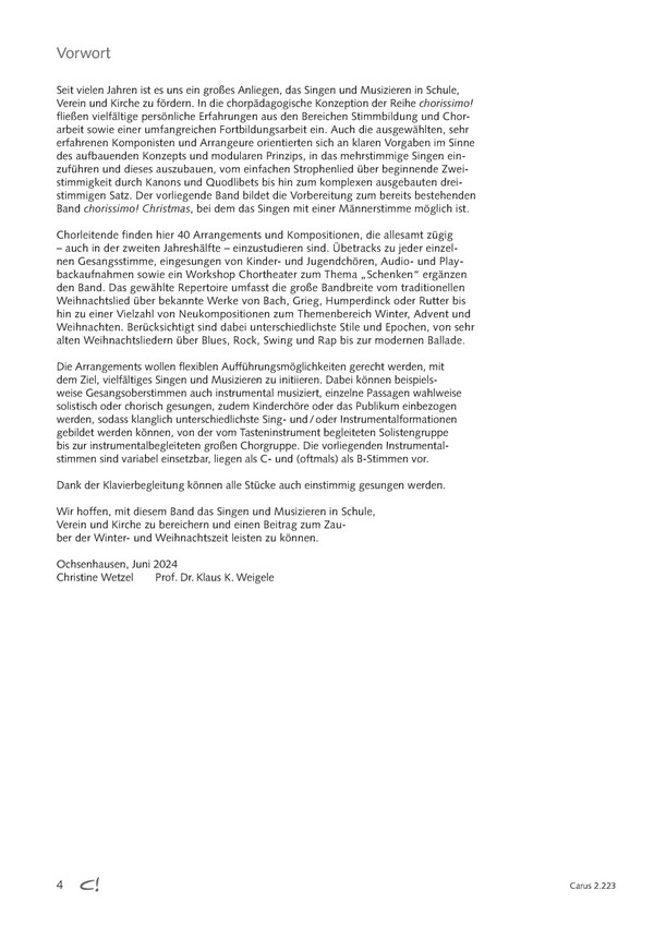 in Zusammenarbeit mit der Landesakademie für die musizierende Jugend in Baden-Württemberg 40 neue Kompositionen und Arrangements Jauchzen, frohlocken, klingende Glocken - Weihnachtszeit ist Liederzeit! 'chorissimo! Winter und Weihnachten' bietet eine Fülle an Kanons, Quodlibets und Lied-Arrangements für das Singen mit Chören und Schulklassen in der Sekundarstufe I. Die praxiserprobten Kompositionen und Neu-Arrangements stammen u.a. von John Rutter, Andrea Figallo, Christoph Schönherr, John Høybye und Peter Schindler. Entsprechend vielfältig ist die stilistische Bandbreite - vom traditionellen Weihnachtslied bis zum jazzy "Winter Wonderland". Zusätzlich zu den Arrangements gibt der Workshop "Chor in Szene gesetzt" Impulse und Ideen für die Konzertgestaltung. 'chorissimo! Winter und Weihnachten' knüpft an das Schulchorbuch 'chorissimo! blue' an. Die winterlichen und weihnachtlichen Arrangements für gleiche Stimmen (S(S)A) mit Klavierbegleitung und optionalen Melodieinstrumenten eignen sich sowohl für das Schulkonzert als auch fürs Klassenmusizieren. Gleichzeitig lässt sich Mehrstimmigkeit im Chor aufbauen: Über Kanons und Quodlibets geht es step by step zur homophonen und polyphonen Mehrstimmigkeit. Zum Proben stehen Playbacks, Audio-Aufnahmen und Übetracks zum Download zur Verfügung.