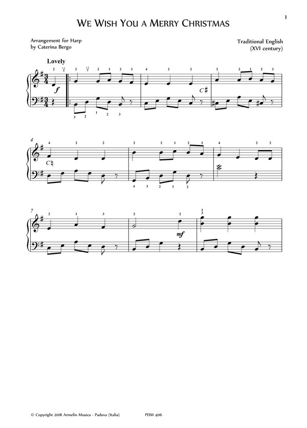 10 Easy Pieces for Little Harpists We wish you a merry christmas The first nowell O christmas tree Jesu, joy of man's desiring Silent night Joy to the world O holy night Jingle bells Shchedryk A white lullaby