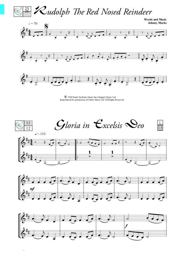 Kling Glöckchen Es wird scho glei dunkel Gloria in Excelsis Deo (klassische und moderne Version) Jingle Bells (happy und Rock-Version) Rudolph The Red Nosed Reindeer We Wish You A Merry Christmas Joy To The World Kommet ihr Hirten- Zu Bethlehem geboren- Der Heiland ist geboren Feliz Navidad Adeste fideles Stille Nacht, heilige Nacht Tochter Zion Winter Wonderland Oh du fröhliche- Alle Jahre wieder Süßer die Glocken nie klingen- Leise reiselt der Schnee Last Christmas Hallelujah G. F. Händel Ave Maria von Caccini Jesus bleibet meine Freude (J. S. Bach) Petersburger Schlittenfahrt Ave Maria (Schubert)
