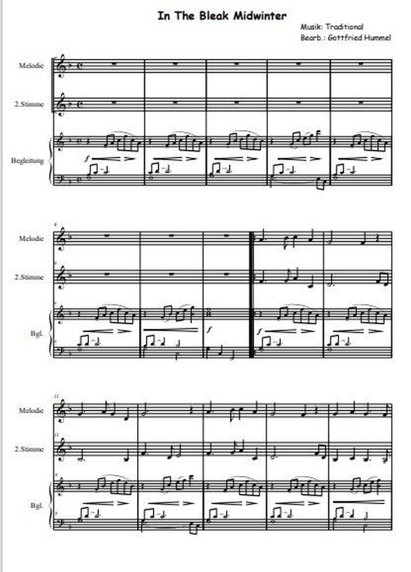 Hummel, Gottfried, arr. Musikalische Köstlichkeiten Musik für Akkordeonorchester Inhalt: Beethoven´s Heilge Nacht Winnetou´s Ave Maria In The Bleak Midwinter Alle Jahre wieder Jingle Bells Die Engel auf dem Felde Stille Nacht Oh du fröhliche Lasst uns froh und munter sein Kling Glöckchen klingeling Das gemeinsame Musizieren macht gerade in der Advents und Weihnachtszeit sehr viel Freude. In dieser Zeit finden sich die verschiedensten Formationen zusammen - sei es in der Familie, im Bekanntenkreis oder als Ensembles und Orchester. Mit dieser vorliegenden Notenausgabe können Sie beliebig variieren. Ein 2. Stimme, ebenfalls Variabel, und eine Begleitstimme runden die Sache ab. Da in dieser Ausgabe neben den Standarts auch musikalische Raritäten wie ""Winnetou´s Ave Maria"" von Karl May persönlich komponiert, Beethovens ""Heilig Nacht"" oder das romantische Traditional ""In The Bleak Widwinter"" vertreten sind, ist es sicher eine Erweiterung jedes Archives.