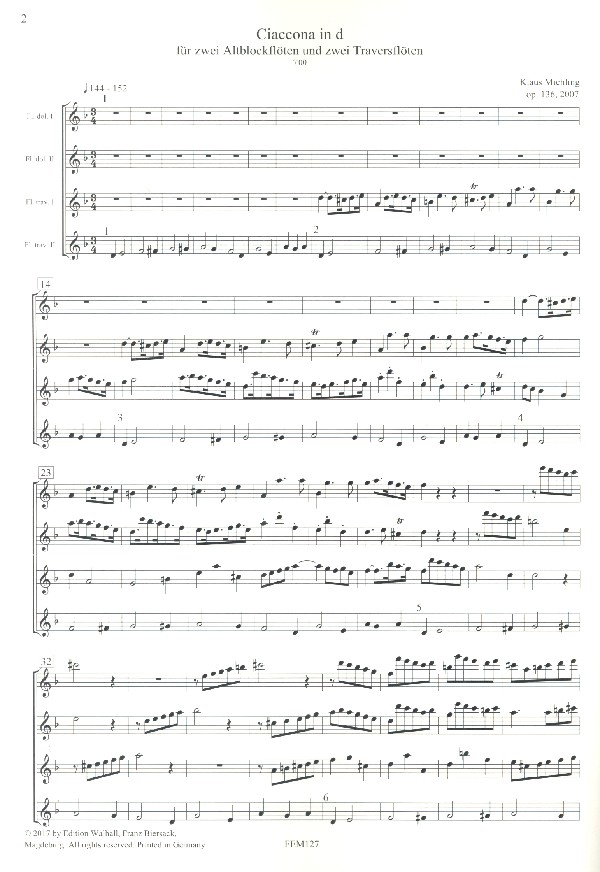 | Untertitel: | für 2 Altblockflöten und 2 Traversflöten Partitur und Stimmen |