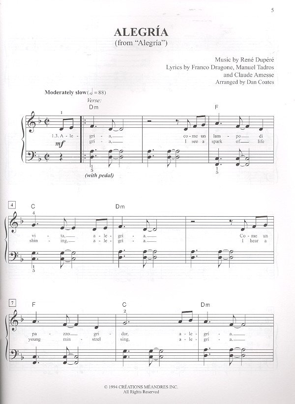 Coates, Dan, arr. A musical Collection Alegria Alone If I could reach your Heart Kumbalawé Kunya Sobé Let me fall Love Dance Mio bello bello amore Nostalgie O Pageant Quidam Triangle Tango