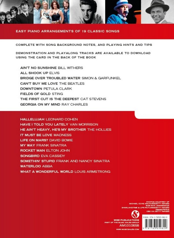 19 classic Songs Ain't No Sunshine (Withers, Bill) All Shook Up (Presley, Elvis) Bridge Over Troubled Water (Simon & Garfunkel) Can't Buy Me Love (Beatles, The) Downtown (Clark, Petula) Fields Of Gold (Sting) The First Cut Is The Deepest (Stevens, Cat) Georgia On My Mind (Charles, Ray) Hallelujah (Cohen, Leonard) Have I Told You Lately (Morrison, Van) He Ain't Heavy, He's My Brother (Hollies, The) It Must Be Love (Madness) Life On Mars? (Bowie, David) My Way (Sinatra, Frank) Rocket Man (John, Elton) Songbird (Cassidy, Eva) Somethin' Stupid (Sinatra, Frank) (Sinatra, Nancy) Waterloo (Abba) What A Wonderful World (Armstrong, Louis)