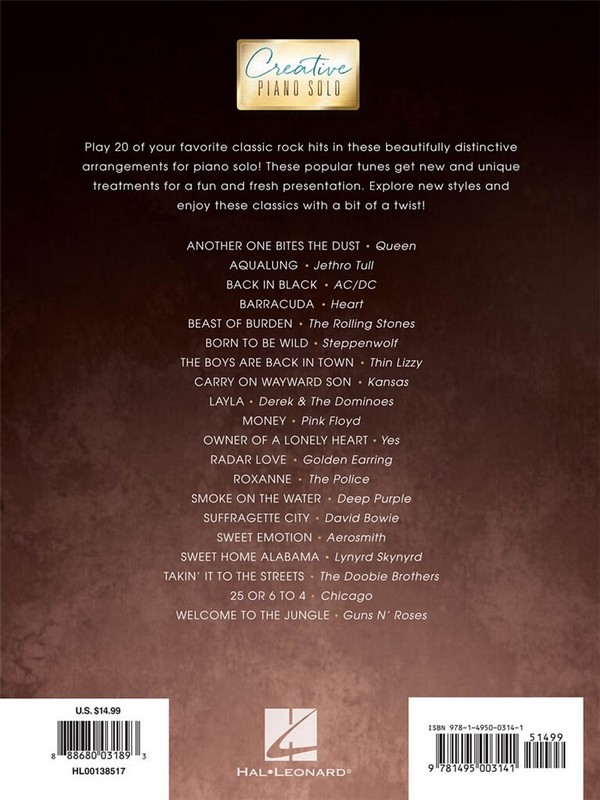 Creative Piano Solo Another One Bites The Dust Aqualung Back In Black Barracuda Beast Of Burden Born To Be Wild The Boys Are Back In Town Carry On Wayward Son Layla Money Owner Of A Lonely Heart Radar Love Roxanne Smoke On The Water Suffragette City Sweet Emotion Sweet Home Alabama Takin' It To The Streets 25 Or 6 To 4 Welcome To The Jungle
