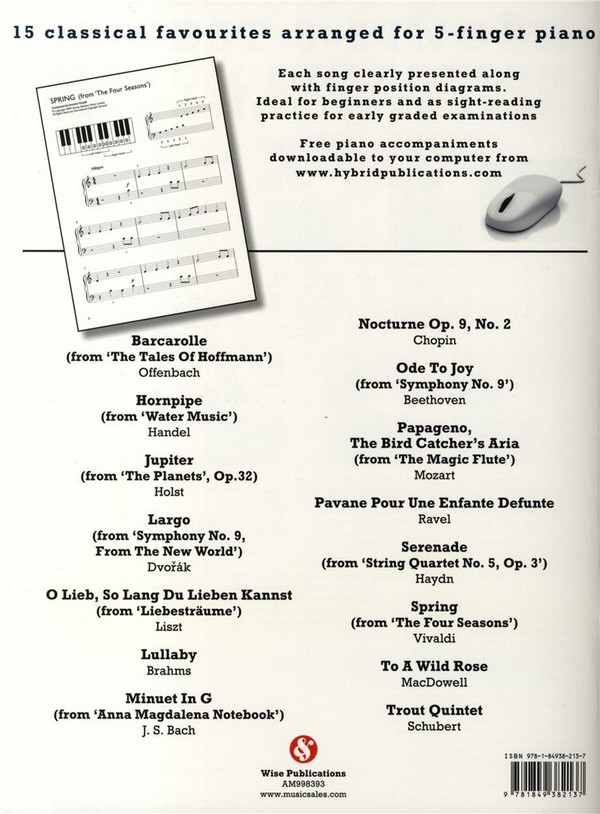 15 classical favourites Barcarolle (Tales Of Hoffman) (Offenbach, Jacques) Hornpipe (Water Music) (Handel, George Frideric) Jupiter's Theme (Holst, Gustav) Largo (Symphony No.9 In E Minor 'From The New World' Op.95) (Dvorak, Antonin) Lullaby (Brahms, Johannes) Minuet In G (Bach, Johann Sebastian) Nocturne In E Flat Op.9 No.2 (Chopin, Frederic) O Lieb, So Lang Du Lieben Kannst (Liebesträume) (Liszt, Franz) Ode To Joy (Symphony No.9) (Beethoven, Ludwig Van) Papageno's Aria (The Magic Flute) (Mozart, Wolfgang Amadeus) Pavane Pour Une Enfante Defunte (Ravel, Maurice) Serenade (String Quartet Op.3 No.5) (Haydn, Franz Joseph) Spring (The Four Seasons) (Vivaldi, Antonio) To A Wild Rose (MacDowell, Edward) Trout Quintet (4th Movement) (Schubert, Franz)