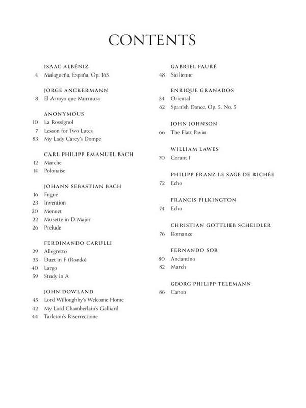 Romantic, Baroque and Renaissance Music in Standard Notation and Tablature 1. Spanish Dance, Op. 5, No. 5 2. Prelude 3. Andantino 4. Study in A 5. March 6. Canon 7. Allegretto 8. Menuet 9. Largo 10. Polonaise 11. Romanze 12. Echo 13. Invention 14. Sicilienne 15. Fugue 16. La Rossignol 17. Lesson for Two Lutes 18. Malaguena, Espana, Op. 165 19. Corant 1 20. Duet In F (Rondo) 21. El Arroyo Que Murmura 22. My Lord Chamberlain's Galliard 23. The Flatt Pavin 24. Oriental 25. My Lady Carey's Dompe 26. Marche 27. Lord Willoughby's Welcome Home 28. Tarleton'S Riserrectione 29. Musette in D Major