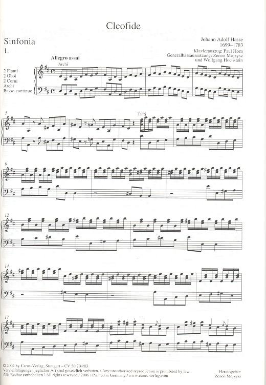 Hasses Oper von 1731 kann als der Höhepunkt seines bisherigen Schaffens angesehen werden - nicht zuletzt, weil der Komponist einige der besten Arien aus seinen früheren Werken in 'Cleofide' integrierte. Das antike Thema - Alexanders indische Eroberungen - eignete sich sehr gut, um August dem Starken, einem eher glücklosem Feldherrn, der gerade dabei war, seine Armeen zu reorganisieren, zu schmeicheln. Für den Dresdner Gebrauch wurde Metastasios Originallibretto von Michelangelo Boccardi bearbeitet. Dabei änderte sich der Titel von 'Alessandro nell' Indie' in 'Cleofide' und die Primadonna, Faustina, wurde zur Hauptfigur des Geschehens. Musikalisch befand sich die Oper auf der Höhe seiner Zeit. Hasses ausdrucksvoller und gleichzeitig natürlicher Stil wurde vom Publikum wie auch von den Profimusikern gleichermaßen bewundert und geschätzt. Die Gesangspartien wurden den Sängen 'auf den Leib geschrieben' und das Dresdner Orchester konnte als Ganzes und auch dank der hervorragenden Solisten glänzen. Hasse bemühte sich immer, aus seinen Musikern das beste herauszuholen. Im Fall von 'Cleofide' gelang es ihm hundertprozentig. Die im Rahmen einer Hasse-Auswahlausgabe beim Carus-Verlag erscheinende Edition der Oper ist die erste gedruckte Ausgabe. Sie basiert hauptsächlich auf den Originalstimmen der Uraufführung von 1731 und bietet eine gleichermaßen wissenschaftlich korrekte wie auch praktische Aufbereitung dieser Quellen.