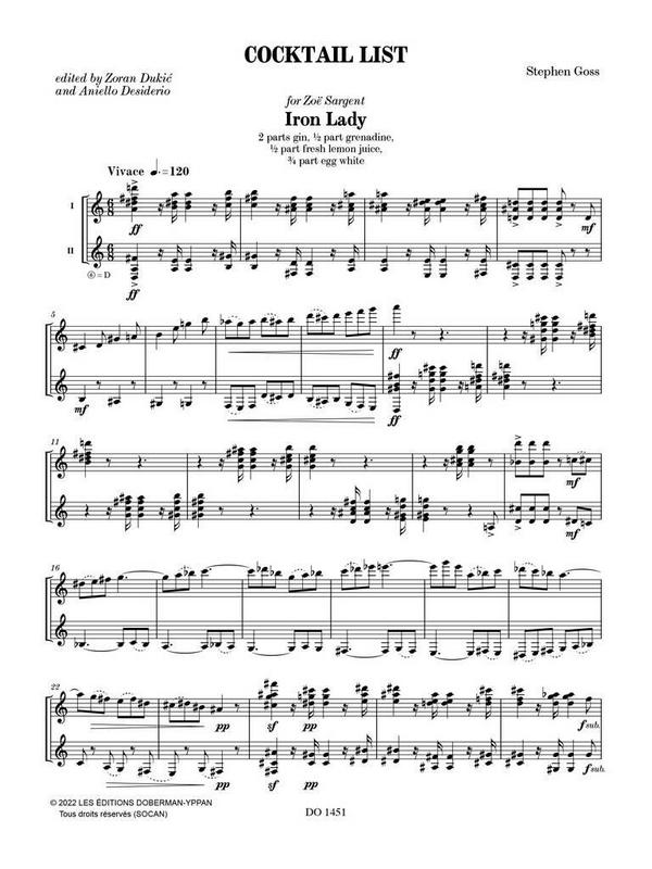 Iron Lady - Nobilmente Pina Colada - Cha cha cha The Last Word - Fast Funk Negroni - Aria nostalgica Caipirinha - Choro Vieux Carré - Blues Bloody Mary - Hungover Alabama Slammer - Song Mojito - Son Boulevardier - Hot Vodka Martini - Agitato, non mescolato Manhattan - Stomp