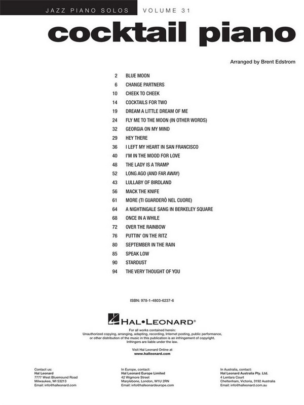 Jazz Piano Solos vol.31 Cool, jazzy Arrangements of 23 most-requested Standards at the Piano Lounge Blue Moon Change Partners Cheek To Cheek Cocktails For Two Dream A Little Dream Of Me Fly Me To The Moon (In Other Words) Georgia On My Mind Hey There I Left My Heart In San Francisco I'm In The Mood For Love The Lady Is A Tramp Long Ago (And Far Away) Lullaby Of Birdland Mack The Knife More (Ti Guarderò Nel Cuore) A Nightingale Sang In Berkeley Square Once In A While Over The Rainbow Puttin' On The Ritz September In The Rain Speak Low Stardust The Very Thought Of You