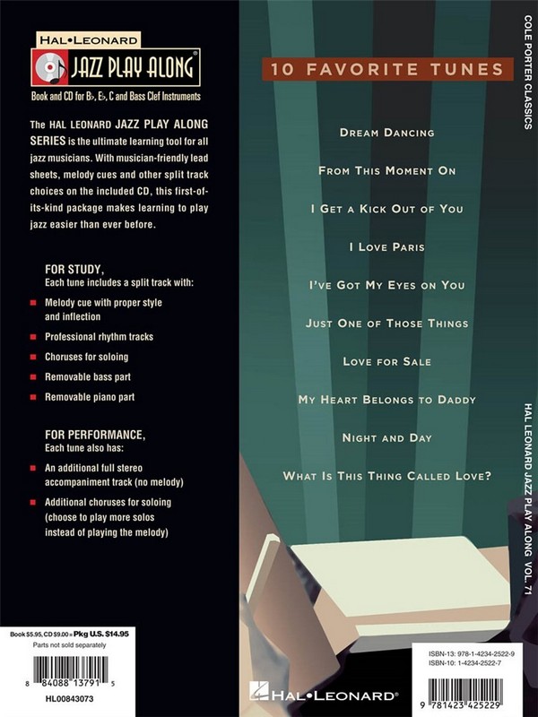 Tayler, Mark, arr. For use with all Bb, Eb, and C instruments, the JAZZ PLAY ALONG SERIES is the ultimate learning tool for all jazz musicians. With musician-friendly lead sheets, melody cues, and other split-track choices on the included CD, this first-of-its-kind package makes learning to play jazz easier than ever before. FOR STUDY, each tune includes a split track with: - Melody cue with proper style and inflection - Professional rhythm tracks - Choruses for soloing - Removable bass part - Removable piano part. FOR PERFORMANCE, each tune also has: - An additional full stereo accompaniment track (no melody) - Additional choruses for soloing From This Moment On Dream Dancing I Get A Kick Out Of You I Love Paris I've Got My Eyes On You Just One Of Those Things Love For Sale My Heart Belongs To Daddy Night And Day What Is This Thing Called Love?