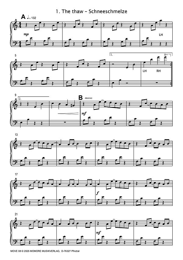12 musical snapshots The Thaw - Schneeschmelze Watching the clouds drift by - Schauen wie die Wolken ziehen The sun in the lake Sonne im See Feeling protected - Behütet sein At peace, n a safe place - Ungestört, an sicherem Ort Warm summer rain - Warmer Sommerregen The starry canopy above me - Über mir das sternenzelt Light is swallowed by the mist - Nebel schluckt Licht Water finds its own level - Das Wasser weiß den Weg Jumping is like flying Springen ist wie Fliegen Gragrant petals - Duftende Blütenblätter The colours of spring - Die Pracht des Frühlings