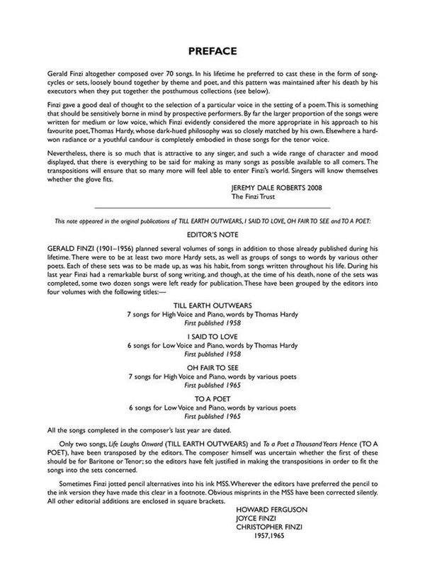 Dale Roberts, Jeremy, ed 54 Songs including 8 Cycles or Sets BEFORE AND AFTER SUMMER: Childhood among the Ferns Before and after Summer The Self-unseeing Overlooking the River Channel Firing In the Mind's Eye The Too Short Time Epeisodia Amabel He Abjures Love EARTH AND AIR AND RAIN: Summer Schemes When I set out for Lyonnesse Waiting for Both The Phantom So I have fared Rollicum-Rorum To Lizbie The Clock of the Years In a Churchyard Proud Songsters I SAID TO LOVE: I need not go At Middle-Field Gate in February Two Lips In five-score Summers For Life I had never cared greatly I said to Love LET US GARLANDS BRING: Come away, come away, death Who is Sylvia? Fear no more the heat o' the sun O Mistress Mine It was a lover and his lass LOVE'S LABOUR'S LOST: Songs for Heims and Ver (Song for Moth) Riddle Song False Colcolinel OH FAIR TO SEE: I say I'll seek her Oh fair to see As I lay in the early sun Only the wanderer To Joy Harvest Since we loved TILL EARTH OUTWEARS: Let me enjoy the earth In years defaced The Market-Girl I look into my glass It never looks like summer At a lunar Eclipse Life Laughs Onward TO A POET: To a Poet a Thousand Years Hence On Parent Knees Intrada The Birthnight June on Castle Hill Ode on the rejection of St. Cecelia