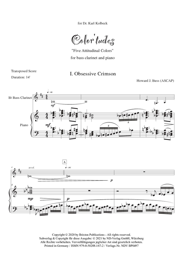 Color'tudes 'Five Attitudinal Colors'' für Bass Klarinette und Klavier Klavier inkl. Einzelstimme Schwierigkeitsgrad: sehr schwer NDV BP0497 Farben beeinflussen eine Vielzahl von Aspekten des menschlichen Seins, vor allem Stimmungen und Emotionen sowie den Geschmackssinn und die Zeitwahrnehmung des Menschen. Zu zahlreich, um in diesem Vorwort erwähnt zu werden, sind die tausenden anderen Möglichkeiten, wie Farben unser Leben beeinflussen. Diese Suite aus fünf Charakter Stücken für Bassklarinette und Klavier verkörpert musikalisch die Eigenschaften der jeweiligen Farben. Die Temperamente der Sätze reichen von nachdenklich und besinnlich bis verspielt und temperamentvoll. Color'tudes wurde für den Bassklarinettisten Dr. Karl Kolbeck komponiert. Er und Dr. Angela Miller-Niles brachten es am 23. April 2021 am Wayne State College zur Uraufführung. Über den Komponisten Howard J. Buss (geb. 1951) ist international als Komponist zeitgenössischer klassischer Musik anerkannt. Seine Kompositionen wurden von der Kritik gelobt und in mehr als 50 Ländern aufgeführt. Seine Musik wird häufig bei nationalen und internationalen Musikkongressen und Festivals aufgeführt. Fakultätsmusiker bedeutender Universitäten sowie derzeitige und ehemalige Mitglieder von Organisationen wie dem Boston Symphony Orchestra, dem Minnesota Orchestra, dem Buffalo Philharmonic, dem Israel Philharmonic, den Berliner Philharmonikern, dem Vancouver Symphony, dem Atlanta Symphony, dem New York Philharmonic, dem Chicago Symphony usw. haben sie aufgeführt. Eine Kopie seiner patriotischen Komposition Fanfares befindet sich in der Präsidentensammlung von Ronald Reagan. Buss' mehr als 190 veröffentlichte Werke umfassen Instrumentalsoli, Kammermusik, symphonische, Chor- und Bandkompositionen. Buss hat zahlreiche Auszeichnungen erhalten und seine Auftragswerke umfassen sowohl Original Kompositionen als auch Arrangements. Seine Werke werden häufig in Dissertationen, Vorträgen, Fachzeitschriften und Bibliographien der Musikliteratur aufgenommen und analysiert, und seine Kompositionen wurden bei Albany, Bottega Discantica (Italien), Crystal, Capstone, DUX (Polen), Equilibrium, HoneyRock, 4-Tay, IBS Classical (Spanien), PL Productions, C. Alan Publications, Ravello (PARMA) und Urania (Italien). Howard J. Buss erhielt seinen B.A. in Angewandter Musik von der West Chester University, seinen M.M. in Performance und M.M. in Komposition von der Michigan State University und seinen D.M.A. in Komposition von der University of Illinois. Er ist Gründer und Herausgeber von Brixton Publications (ASCAP) und Buss Publications (BMI), die zeitgenössische amerikanische Konzertmusik veröffentlichen.