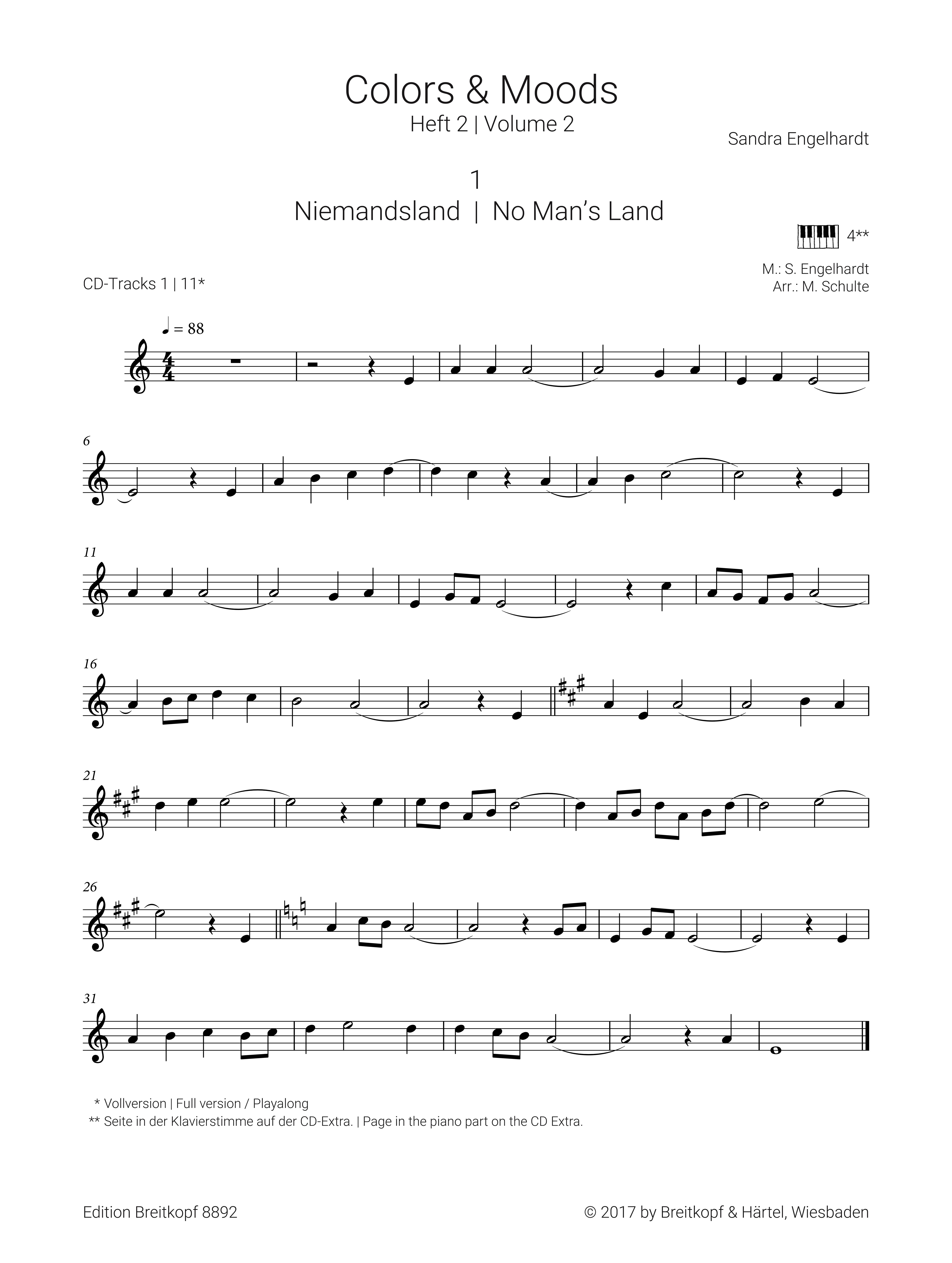 30 stilistisch vielfältige Spielstücke, die den Anfang auf der Querflöte begleiten. Kinder, Jugendliche und Erwachsene gehen auf eine musikalische Entdeckungsreise, deren Vielfalt von barocken Klängen über Tanzformen wie Tango und Flamenco bis hin zum ganz großen Kino reicht. Der bestechende Vorteil dieser Reihe ist, dass sie den Lehrkörpern brauchbares Material liefert, um Themen zu vertiefen, zu ergänzen, zu strecken oder zu sichern. Stimmungsvolle Titel, die pfiffige Spiel- und Interpretationsanreize hervorrufen, und eine reiche Bandbreite an Stilistiken garantieren dem musikalischen Triptychon sicher rasch einen festen Platz auf dem Markt guter Literatur für Flötenschüler. (Claudia Wälder-Jene, Flöte aktuell) Colors & Moods verdient einen festen Platz im Repertoire für Flötenanfänger und zeigt eine Leichtigkeit, Spielfreude und Professionalität, die außergewöhnlich ist und die Reihe auch für ausländische Märkte interessant macht. (Ines Zimmermann, Tibia) Schulte, Martin, arr. Stimmungsvolle Stücke Niemandsland Tanz der Spielleute Klassisch Die Zeit schläft nie Präludium Zwei Welten Es war einmal Joe, Jim, Sally, and Sue Salsa Gesang der Meerjungfrau