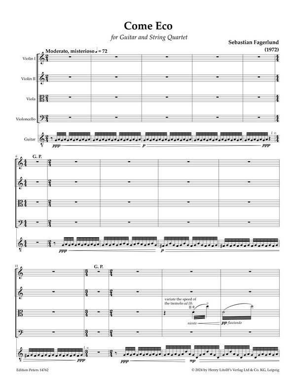 Come Eco for guitar and string quartet is commissioned by Kuhmo Chamber Music Festival. In the piece, you can hear echoes from my earlier works, but I have also been fascinated by the idea of echoes in an acoustic space, How the original sound is transformed and reflected in the ensemble and how the musical material develops as the music progresses.'