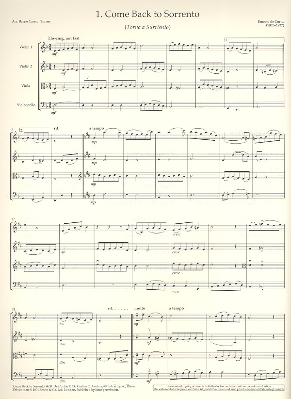 Turner, Barrie Carson, ed 8 bekannte Streichquartette, Come back to Sorrento (Curtis) Furniculi Furnicula (Denza) Tango (Albeniz) None but the lonely heart (Tschaikowski) Melody in F (Rubinstein) Ständchen (Schubert) Plaisir d'amour (Martini)