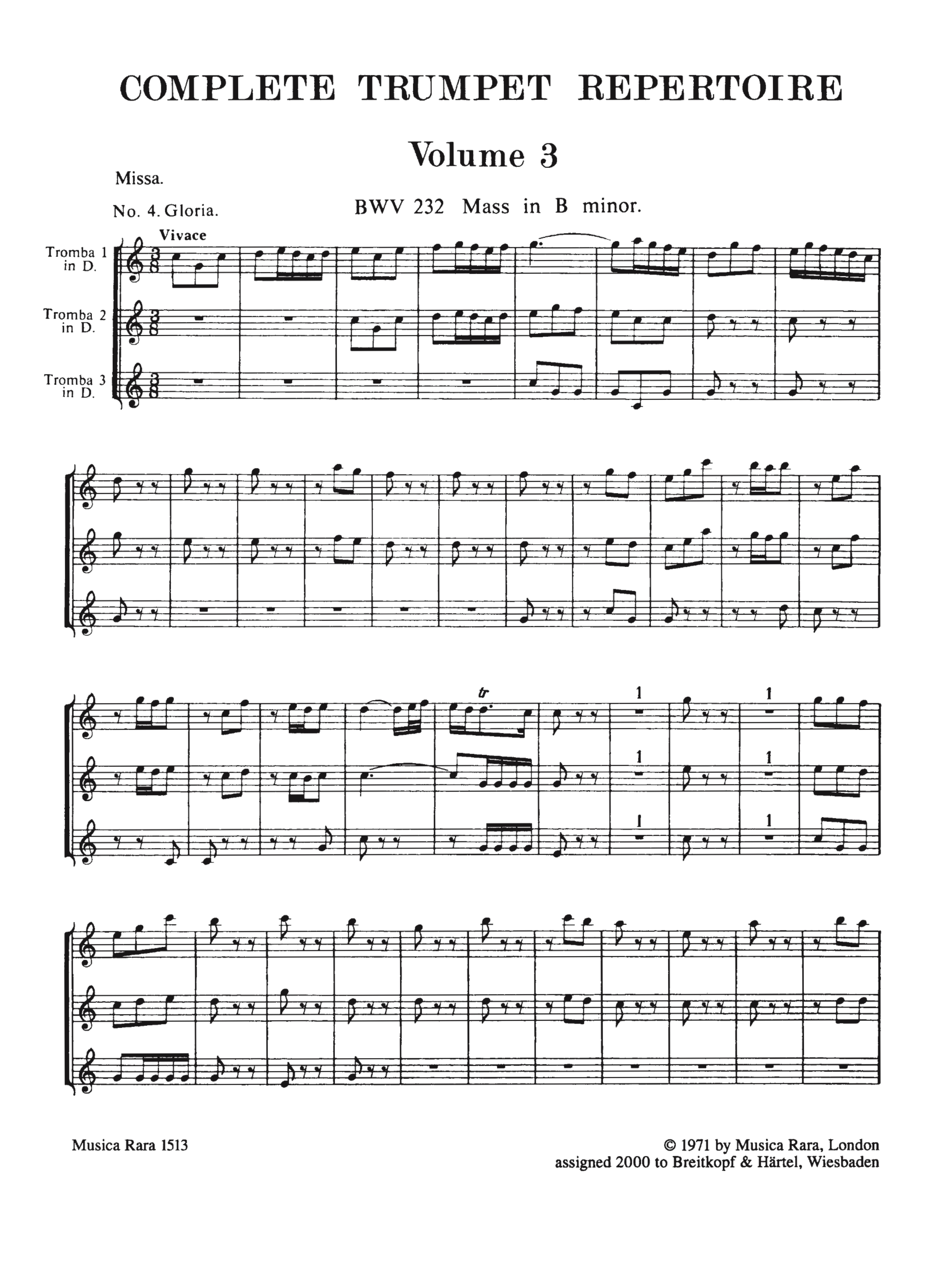 Vollständiges Trompeten-Repertoire Masses, Oratorios, Secular Cantatas, Orchestral Works BWV232 h-Moll-Messe BWV237 Sanctus in C BWV243 Magnificat in D BWV243a Magnficat in Es BWV248 Weihnachtsoratorium - Jauchzet frohlocket BWV249 Osteroratorium - Kommt eilet und laufet BWV201 Der Streit zwischen Phoebus und Pan - Geschwinde ihr wirbelnden Winde BWV205 Der zufriedengestellte Aelos - zerreisset zersprenget zertrümmert die Gruft BWV206 Schleicht spielende Wellen BWV207 Vereinigte Zwietracht der wechselnden Saiten BWV207a Auf schmetternde Töne BWV214 Tönet ihr Pauken erschallet Trompeten BWV215 Preise dein Glücke gesegnetes Sachsen BWV217 Entfliehet verschwindet entweichet ihr Sorgen BWV1045 Sinfonia BWV1047 Brandenburgisches Konzert Nr.2 BWV1068 Orchestersuite Nr.3 BWV1069 Orchestersuite Nr.4