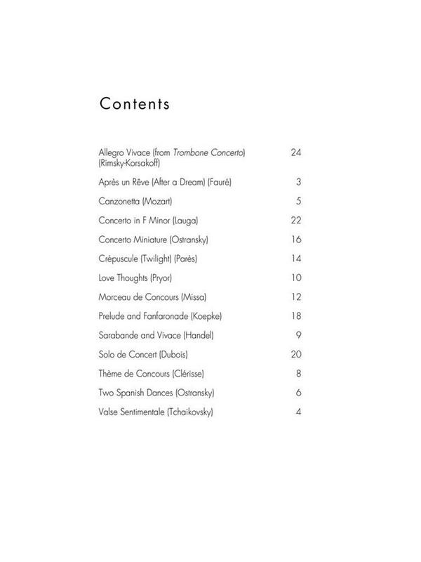Voxman, H., ed Allegro vivace from Concerto (Rimski-Korsakoff) Apres un reve (Faure) Canzonetta (Mozart) Concerto in f minor (Lauga) Concerto miniature (Ostransky) Crepuscule (Pares) Love Htoughts (Pryor-Johnson) Morceau de concours (Missa) Prelude and Fanfaronade (Koepke) Sarabande and vivace (Händel) Solo de concert (Dubois) Theme de concours (Clerisse) 2 spanish Dances (Ostransky) Valse sentimentale (Tschaikowsky)