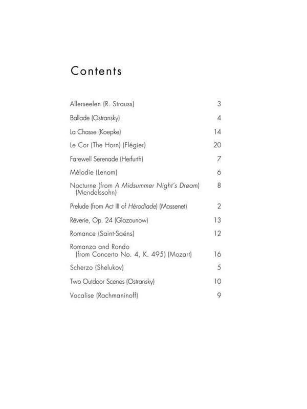 Voxman, Himie, arr. Allerseelen (Strauss) Ballade (Ostransky) Farewell serenade (Herfurth) La chasse (Köpke) Le cor (Flegier) Melodie (Lenom) Nocturne (Mendelssohn) Prelude from Act 3 of Herodiade (Massenet) Reverie (Glasunow) Romance (Saint-Saens) Romanza and rondo (Mozart) Scherzo (Shelukov) 2 outdoor scenes (Ostransky) Vocalise (Rachmaninow)