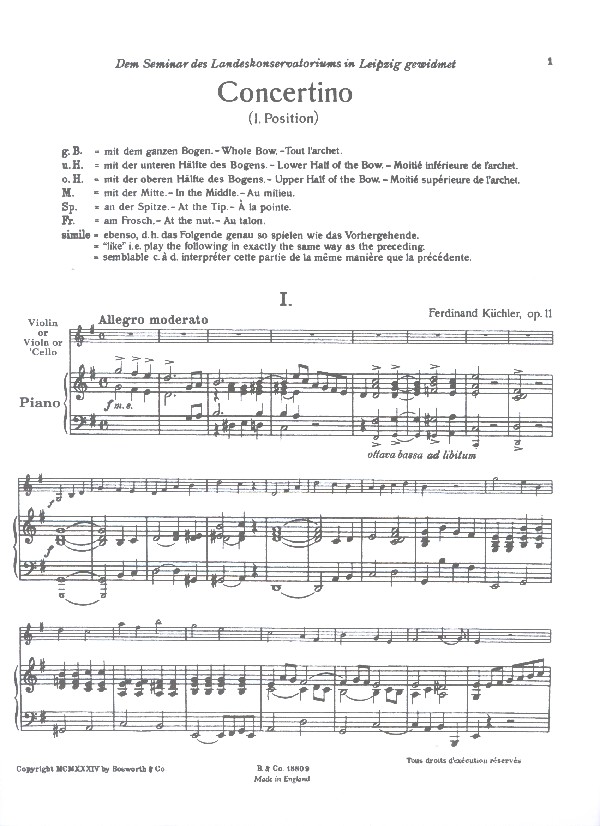 Ferdinand Kuchler's terrific Concertino in G, Op. 11, set effectively here for violin and piano accompaniment. All three movements of this concertino are in the first position. Text provided in English, French and German.