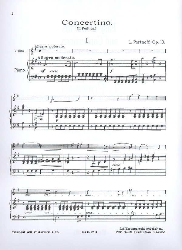 Leo Portnoff's Violin Concertino in E Minor, Op. 13 is written for the first position of the violin. For violin with piano accompaniment.