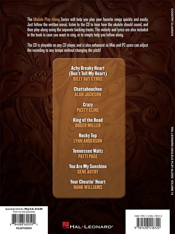 1. Crazy 2. Achy Breaky Heart (Don't Tell My Heart) 3. Chattahoochee 4. Rocky Top 5. Your Cheatin' Heart 6. King Of The Road 7. Tennessee Waltz 8. You are My Sunshine The Ukulele Play-Along series will help you play your favorite songs quickly and easily, with incredible backing tracks to help you sound like a bona fide pro! Just follow the written music, listen to the CD to hear how the ukulele should sound, and then play along with the separate backing tracks. The melody and lyrics are included in the book in case you want to sing, or to simply help you follow along. The CD is playable on any CD player, and also enhanced so Mac & PC users can adjust the recording to any tempo without changing the pitch! Each Ukulele Play-Along pack features eight quintessential songs. Includes these country classics: Achy Breaky Heart (Don't Tell My Heart) · Chattahoochee · Crazy · King of the Road · Rocky Top · Tennessee Waltz · You Are My Sunshine · Your Cheatin' Heart.