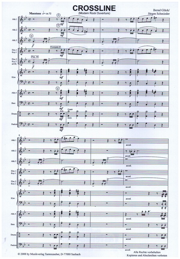 Modern Rock Ouverture Crossline ist eine Gemeinschaftskomposition für Akkordeon-Orchester von Jürgen Schmieder und Bernd Glück. Den Anfang des Stückes bildet eine pompöse Maestoso Einleitung, die in einen groovenden, straffen Rockbeat mündet. Der folgende schnellere Rhythmikteil ist gespickt mit Orchesterhits, die sich mit fließenden 16tel Läufen im Akkordeon 1 und 2 abwechseln. Ein ruhiges, sich aufbauendes Adagio führt danach zu einer gefühlvollen Ballade mit Musical-Charakter. Es folgt eine Reprise der Einleitung und des Rocks, in teils verkürzter Form. Die Coda ist groß angelegt und spiegelt nochmals das Thema wieder, das sich wie ein roter Faden durch die ganze Komposition zieht.