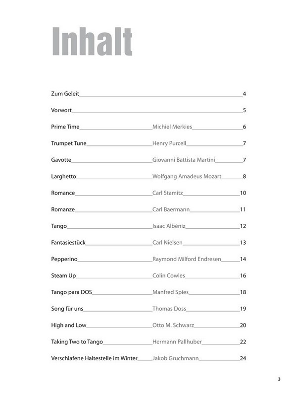Edition DaCapo Ausgewählte Werke für den D1-Bereich Prime Time (Merkies) Trumpet Tune (Purcell) Gavotte (Martini) Larghetto (Mozart) Romance (Stamitz) Romanze (Baermann) Tango (Albéniz) Fantasiestück (Nielsen) Pepperino Milford Endresen) Steam up (Cowles) Tango para DOS (Spies) Song für uns (Doss) High and low (Schwarz) Talking two to Tango (Pallhuber) Verschlafene Haltestelle im Winter (Gruchmann)